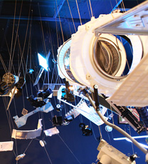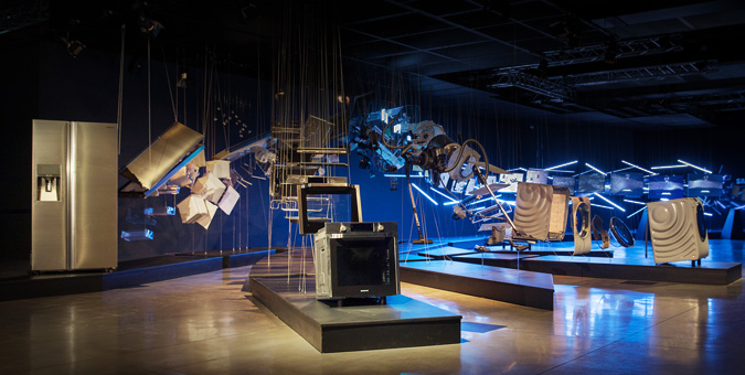 The deconstructed parts and components dissolve into smaller pieces as they pass through multiple screens installed along the evolution path of the journey. The pieces from the present flow into the screen, evolving into digital elements, and then they finally culminate in a big screen. The entire journey is highlighted by the LED lights installed around the screens. As if to show Samsung’s Design DNA, hidden beneath the hard exterior of electronic products, the dissolving pieces symbolize Samsung moving towards an innovative future.