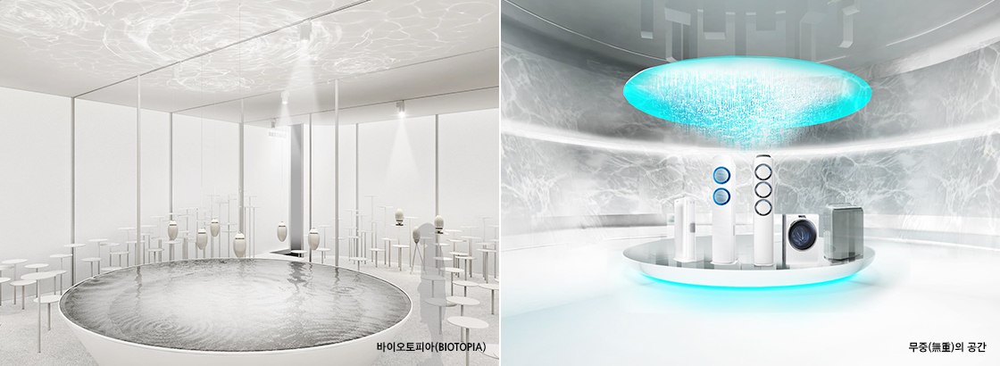 Also, with the work of spatial designer Jung Han Ryu, Home appliance theme hall shows nature's cool and refreshing moments and heightened human sensory at the stage of zero gravity. In order to embody the 'timeless value' that nature holds, the designer placed mirror walls to express limitless boundaries. Furthermore, Ryu created a space that the viewers can actually feel the nature's comfort and refreshing air. Washing machines, A/C, air purifier each represent the symbolic meaning of water, wind, and air.