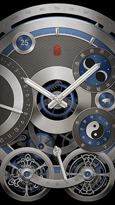 시계 상단과 왼편에는 그레고리력을, 오른편에는