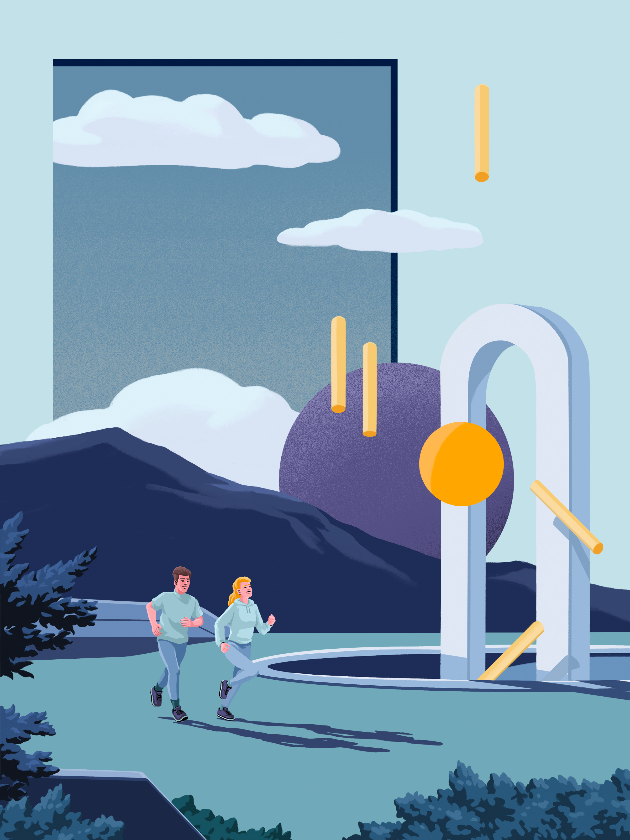 It is an illustration of two people running in the background of future sculptures and nature.