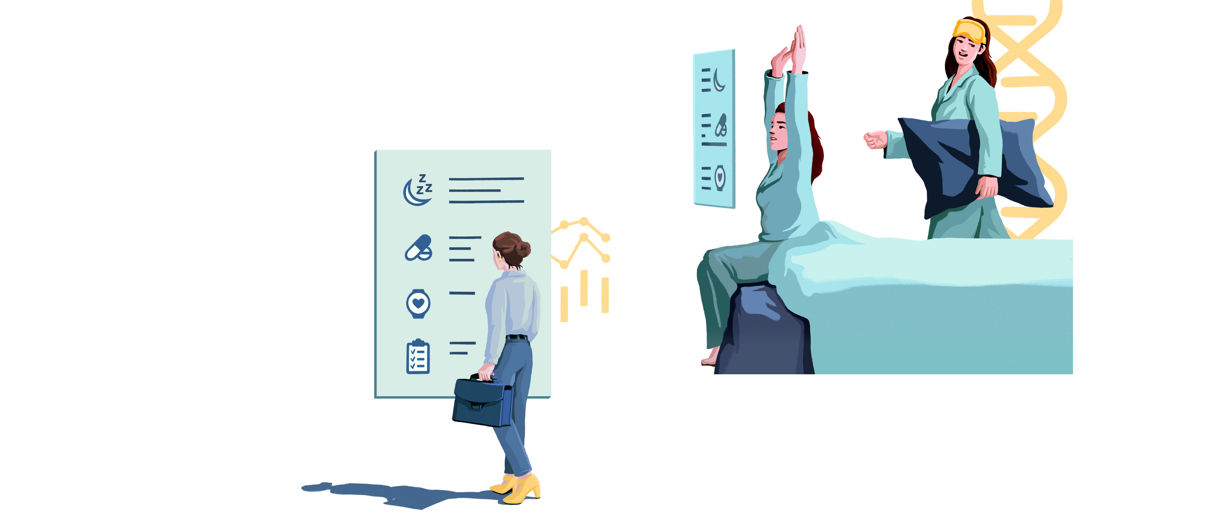 It is an illustration of a woman checking health data in bed.