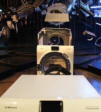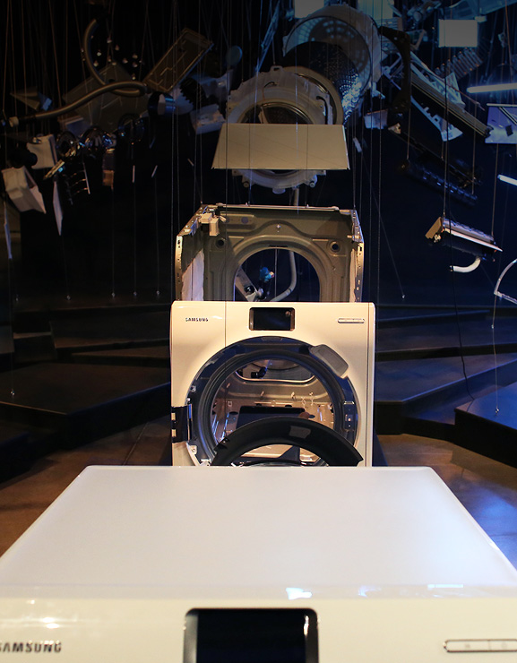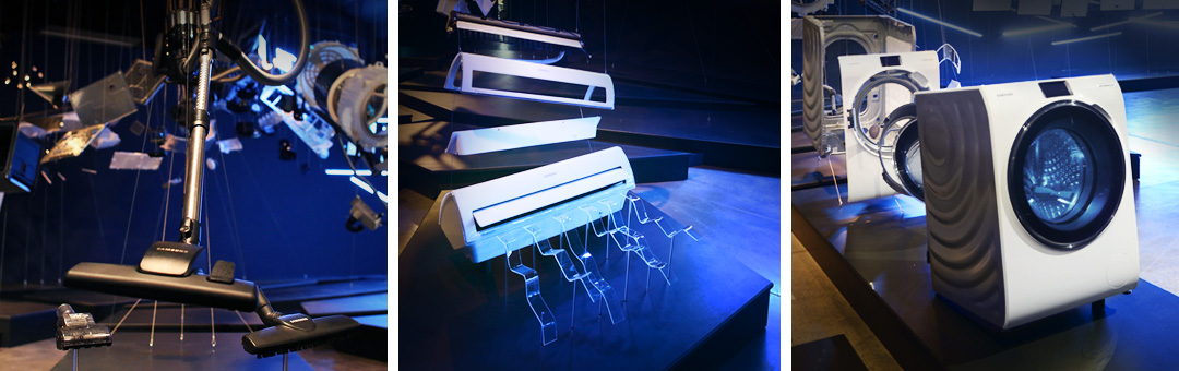 Five representative Samsung appliances greet the audience in midair. Designed to add extra value to our daily lives, the Food Showcase Refrigerator, WW9000 Washing Machine, Motion Sync Vacuum Cleaner, Built-in Oven, and Triangle Rac Air Conditioner each represent the existing innovation and serve as the starting point of the journey.