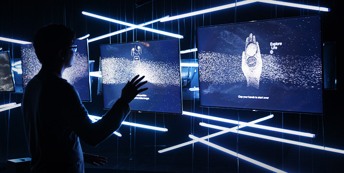 At the end of the journey an interactive screen representing the future awaits the audience. Once you move your hand in front of the screen, small particles which were once product components from the Present form five messages expressing Samsung’s