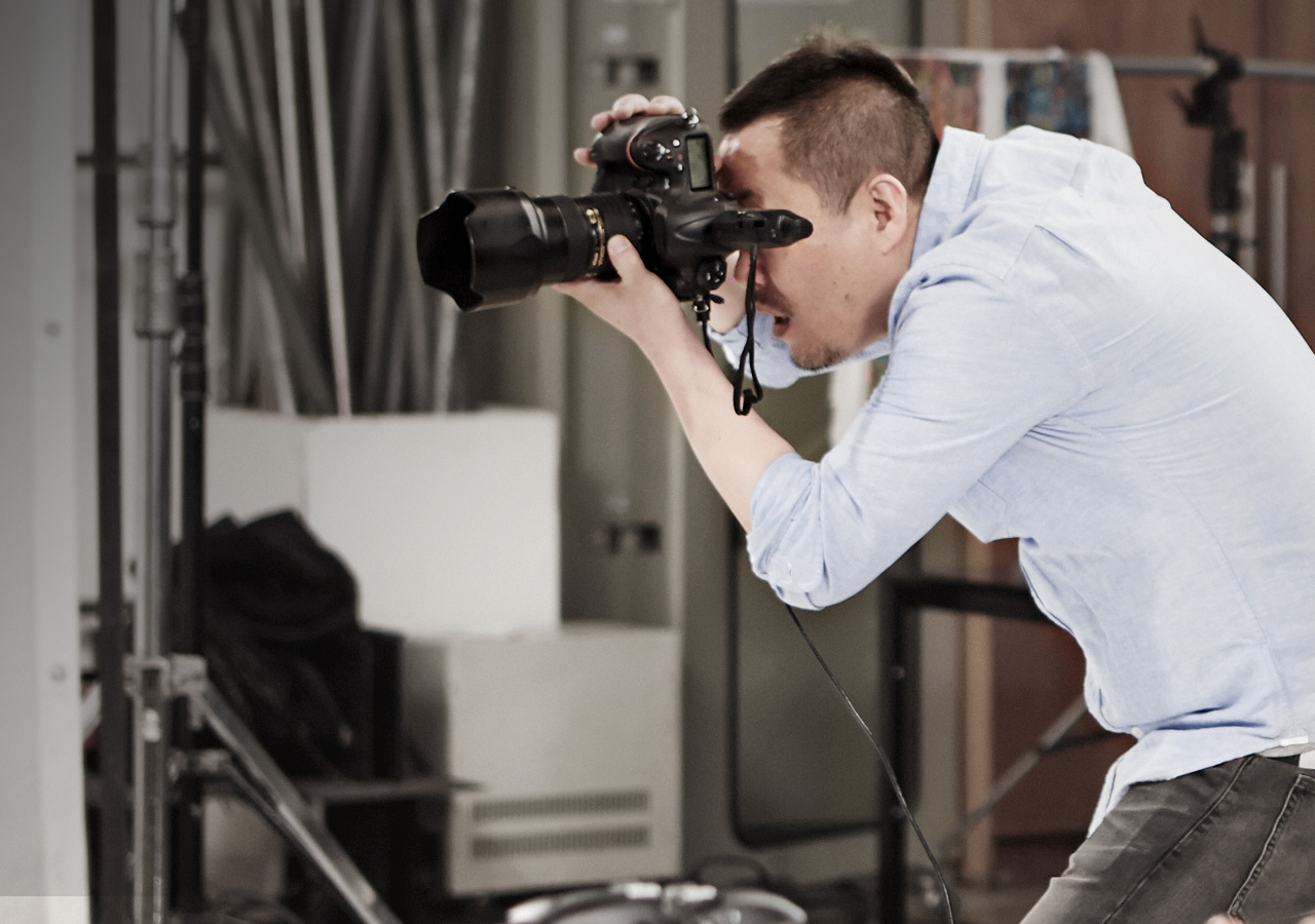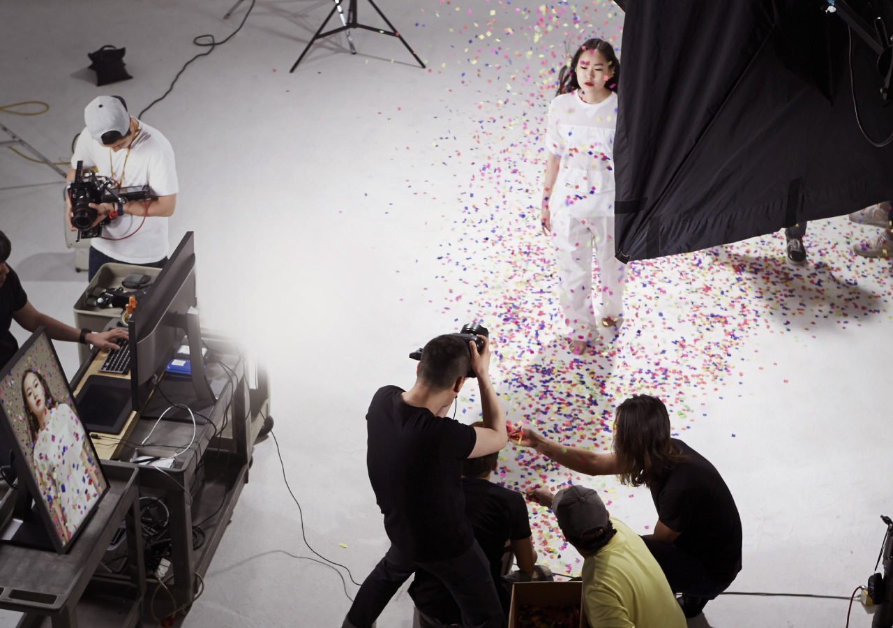 An image shows Jono Lee shooting from behind his camera. The image fades to show the same scene from a different angle, showing confetti falling onto a model.