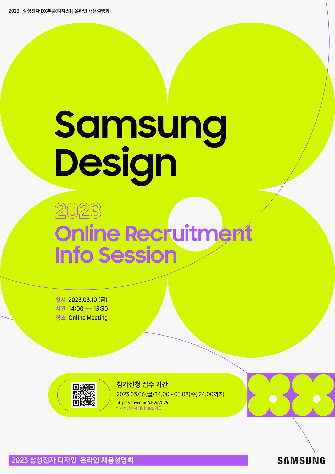 삼성전자 디자인 직무에 관심이 있으신 분, 디자인 채용에 관심이 있으신 분들께 다양한 정보를 제공하고 현업 디자이너와 함께 이야기를 공유하는 행사입니다. 많은 관심 부탁드립니다.