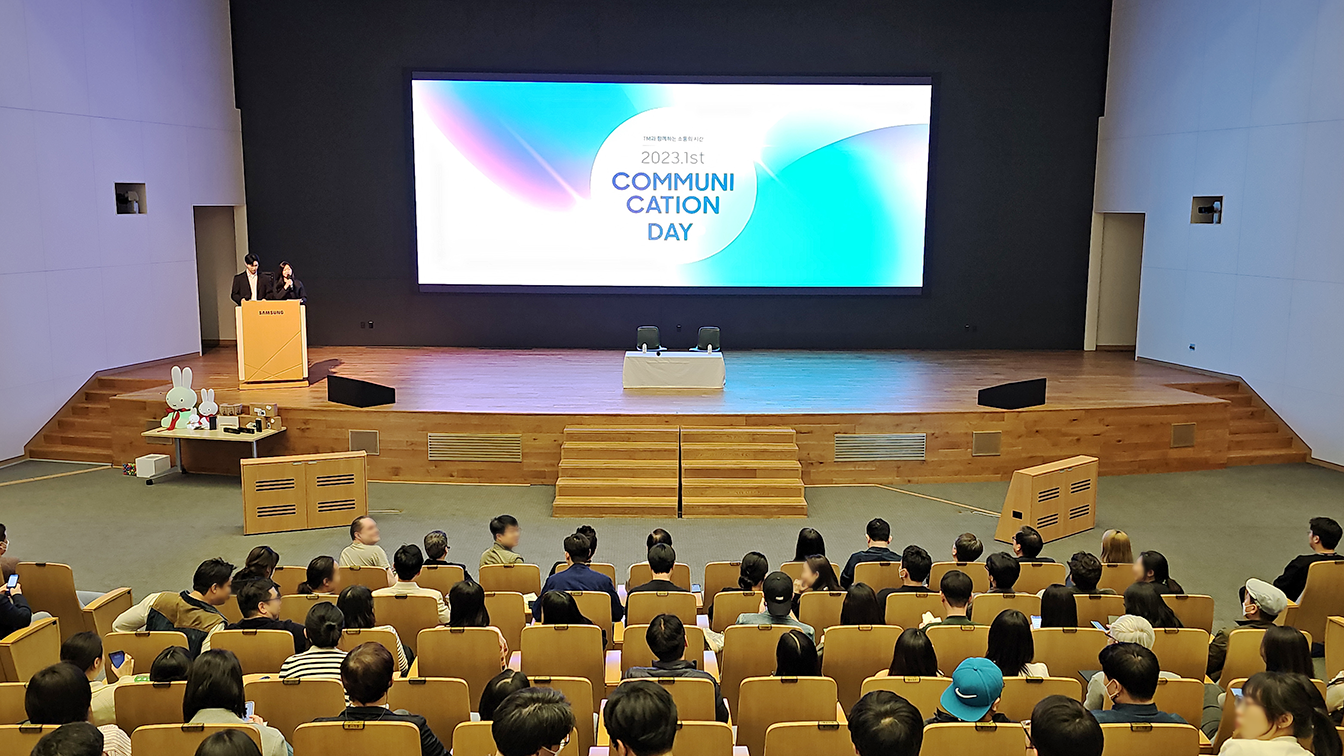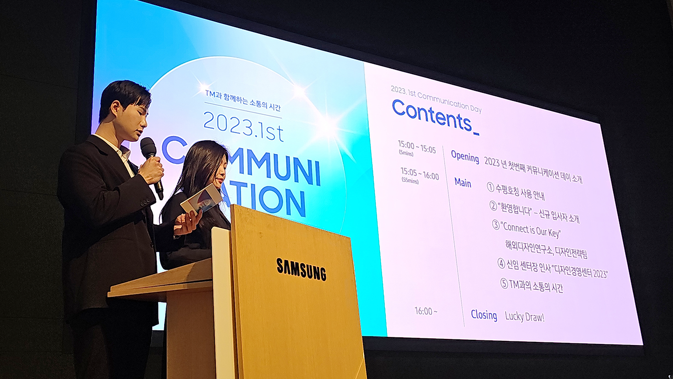 디자인경영센터 임직원들 간 소통과 인사이트 공유를 위해 분기 별 개최되는 디자인경영센터 커뮤니케이션 데이가 지난 4월 7일 금요일, 오후 3시부터 1시간가량 삼성전자 서울 R&D캠퍼스 크리에이티브 홀에서 개최되었다. 특히 이번 행사는 올해 디자인경영센터장으로 새롭게 부임한 노태문 사장도 함께 참석해 임직원들과 소통하는 시간을 가졌다.