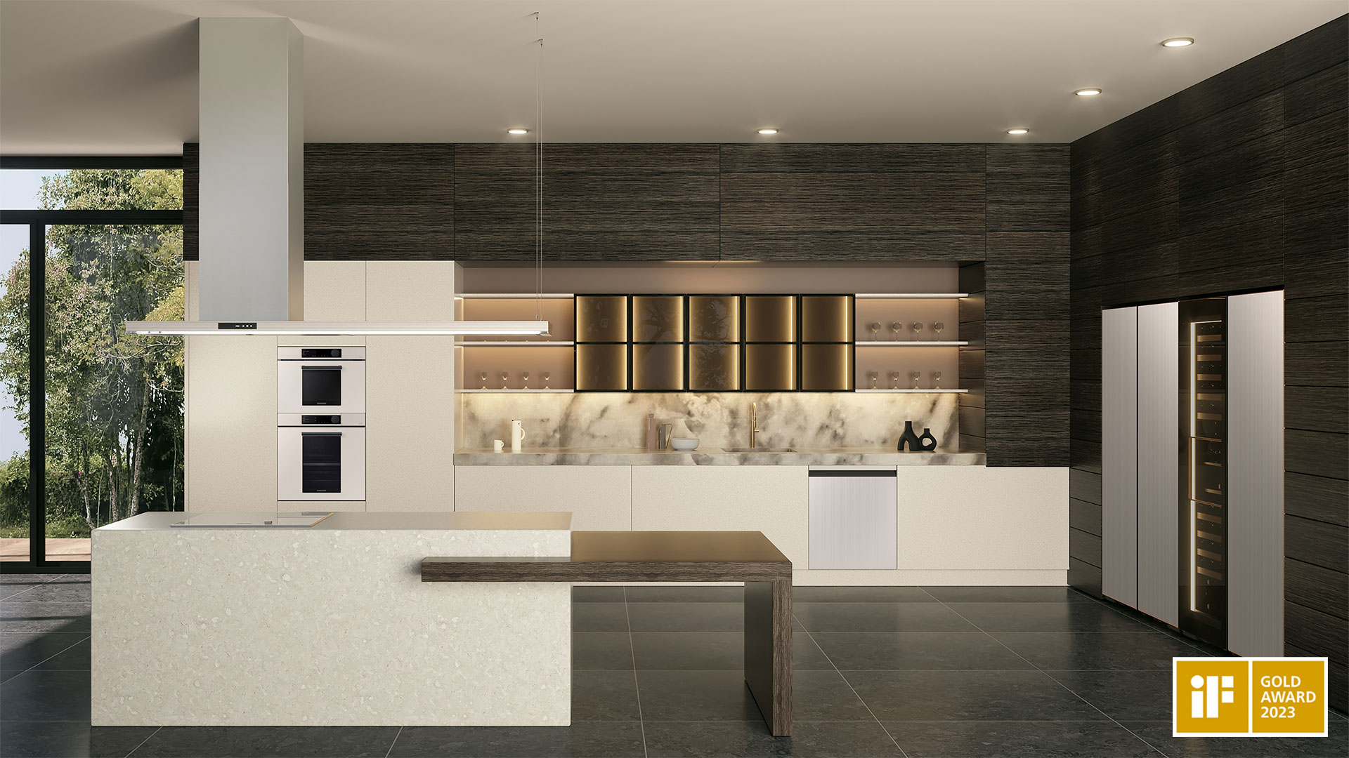 금상을 수상한 ‘비스포크 인피니트 라인’은 냉장고·와인셀러·오븐· 후드로 구성된 주방 가전 조합으로, 알루미늄·스테인리스·세라믹 등의 차별화된 소재를 적용해 프리미엄 라이프스타일 감성의 일체감 있는 디자인을 제공했다. ‘비스포크 인피니트 라인’ 냉장고는 핸들 없이 센서부를 터치하는 것만으로도 손쉽게 도어를 열 수 있는 ‘오토 오픈 도어’, 얼음을 취향이나 용도에 맞게 즐길 수 있는 ‘오토 듀얼 아이스 메이커’, 정수된 물을 알아서 가득 채워주는 ‘오토 필 정수기’ 등 차별화된 편의 기능을 적용해 고객 경험을 극대화 했다. 또한 프리미엄 주방 가구와 잘 어우러지는 인피니트 라인의 빌트인 오븐과 후드를 함께 설치해 고급스러운 주방 인테리어를 완성했다.