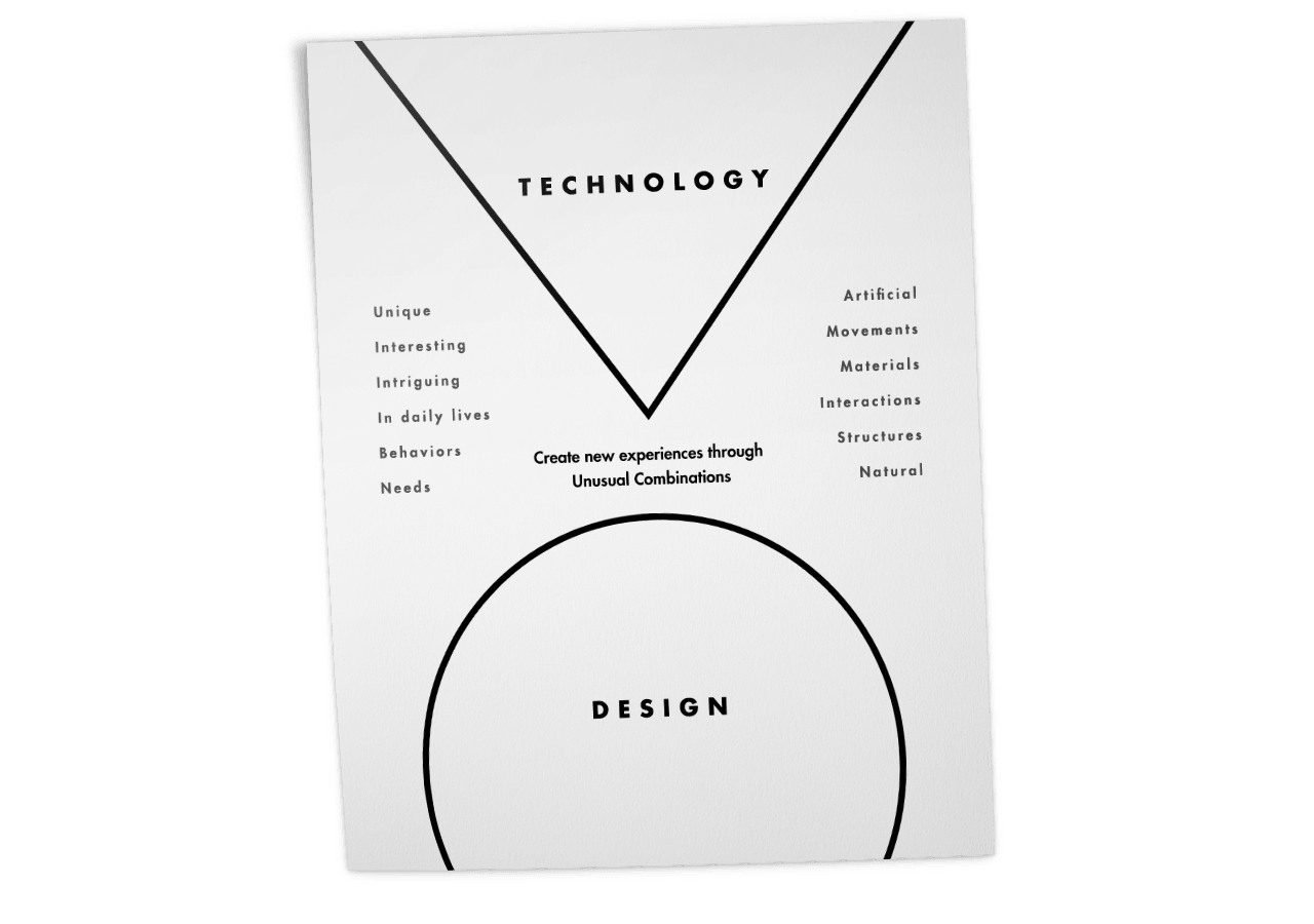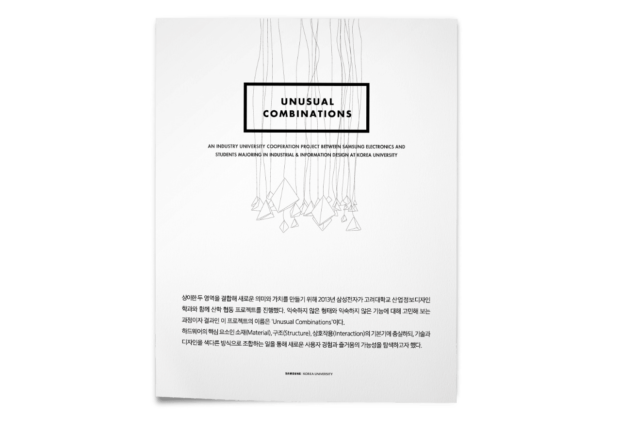 상이한 두 영역을 결합해 새로운 의미와 가치를 만들기 위해 2013년 삼성전자가 고려대학교 산업정보디자인학과와 함께 산학 협동 프로젝트를 진행했다. 익숙하지 않은 형태와 익숙하지 않은 기능에 대해 고민해 보는 과정이자 결과인 이 프로젝트의 이름은 ‘Unusual Combinations’이다. 하드웨어의 핵심 요소인 소재(Material), 구조(Structure), 상호작용(Interaction)의 기본기에 충실하되, 기술과 디자인을 색다른 방식으로 조합하는 일을 통해 새로운 사용자 경험과 즐거움의 가능성을 탐색하고자했다.